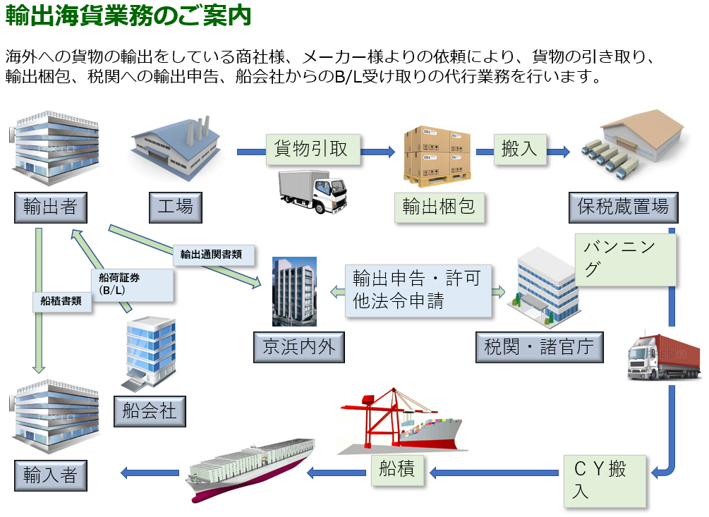 海外への貨物の輸出をしている商社様、メーカー様よりの依頼により、貨物の引き取り、輸出梱包、税関への輸出申告、船会社からのB/L受け取りの代行業務を行います。