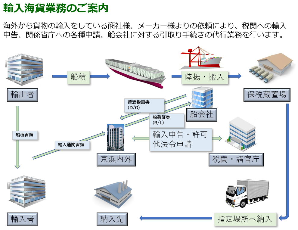 海外から貨物の輸入をしている商社様、メーカー様よりの依頼により、税関への輸入申告、関係省庁への各種申請、船会社に対する引取り手続きの代行業務を行います。
